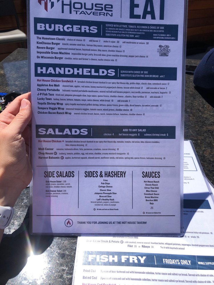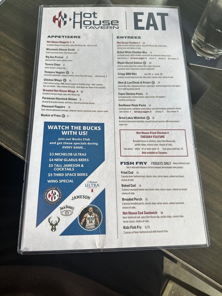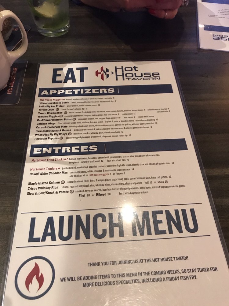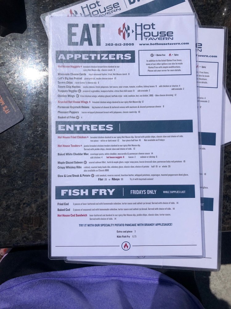 Hot House Tavern in Menomonee Falls offers a diverse menu with New American cuisine. The restaurant provides various amenities like takeout, delivery, vegetarian options, and wheelchair accessibility. Customers praise the friendly service and recommend dishes such as the hot house nuggets, chicken bacon ranch wrap, and blackened chicken sandwich. The establishment also serves craft cocktails, but some find the prices a bit high. The food consistency can vary, with some dishes being hit or miss. Highlights include the Appleton Ave Melt and tempura veggies with a flavorful citrus Thai chili sauce. The waitstaff is consistently friendly, although the ambiance can get loud. Overall, Hot House Tavern provides a pleasant dining experience with a mix of quality dishes, friendly service, and a casual atmosphere.